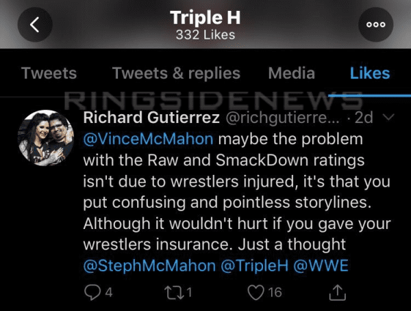 Triple H liked this tweet from Gutierrez, but then he “unliked” the tweet. However, before he was able to unlike the tweet a screenshot was taken to prove that The Game saw and apparently agreed to this observation about WWE.