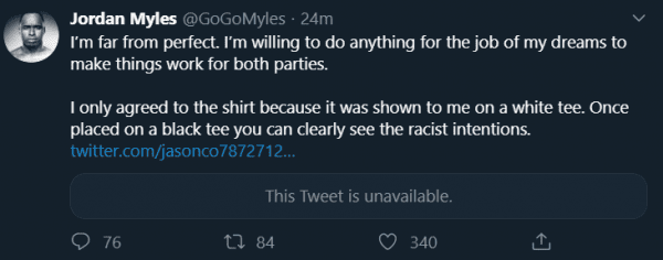 “I only agreed to the shirt because it was shown to me on a white tee. Once placed on a black tee you can clearly see the racist intentions.”