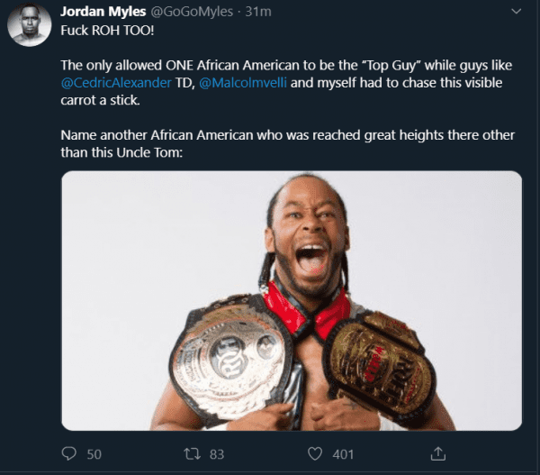 He then took aim at his former employer Ring Of Honor. In a now-deleted tweet, Myles fired off some accusations at ROH. He also called Jay Lethal an “Uncle Tom” in the process.