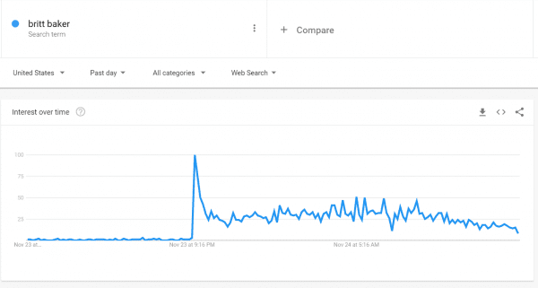 You can check out the Google search trend below. Triple H might have said that the director didn’t know who Britt Baker was and he just shot someone who looked shocked in the crowd. That didn’t seem to matter when it came to fans possibly learning more about AEW while watching an NXT event.