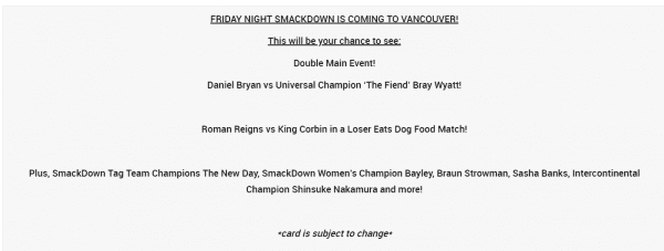 These could also be dark matches. If that is the case then the live crowd in Vancouver might have quite a show on February 14th. You can check out the promoted matches below. Of course, the card is always subject to change.