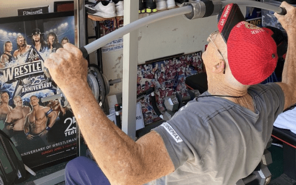 Today my 80yr old Dad, @WWE Hall of Famer Bullet Bob, asked if he could come over to get a workout! He’s got bone cancer in his ribs, shoulder and prostate and chose not to go through any treatment (his choice)! I put 30lbs on there and he said, “Gimme 100lbs!!! #Motivation