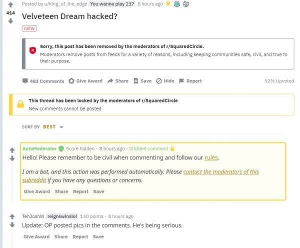 You can read the Reddit post below. It has since been deleted, but the post claims that some girls Velveteen Dream sent photos to were underage. Calls were allegedly made as well where she was able to ID his voice.