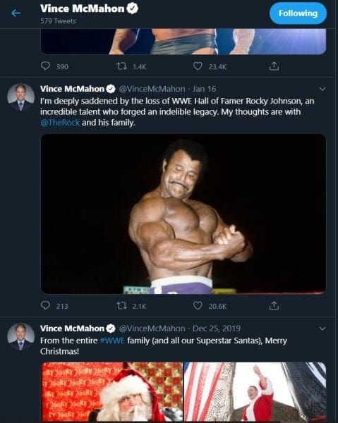 To make things even more interesting, it appears that Vince McMahon didn’t even send a birthday greeting to Shane McMahon for his 50th birthday this year. McMahon’s Twitter timeline shows a gap between Christmas and January 16th when Rocky Johnson passed away.