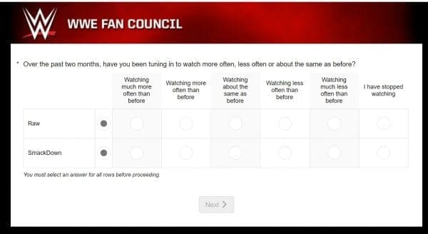 If an answer indicated that channel surfing is part of a fan’s viewing habits, the company wanted to know what’s up with that. “You indicated earlier that you tune in and out while watching Raw. What do you tend to also watch or do in the moments when you are tune away from watching Raw?” A write-in option was available.