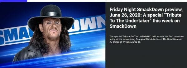 WWE is only promoting a Tribute To The Undertaker for SmackDown this week. It’s not clear how long this tribute will be. The Boneyard Match alone is over 30 minutes in length. As of this writing, the Tribute To The Undertaker is the only segment advertised for SmackDown this week on the company’s official preview.