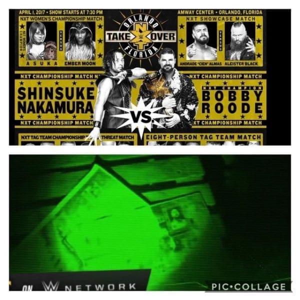 NXT TakeOver: Orlando featured Shinsuke Nakamura vs Bobby Roode for the NXT Title. That poster was seen in the wreckage during that promo. The image of Andrade from that poster is visible.