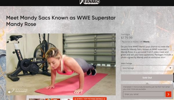 The “Gold Package” gets fans a virtual meet & greet with Mandy Rose. For $179, fans get a virtual meet & greet with Rose, a video of their encounter, a signed 8×10, and a t-shirt.