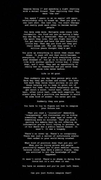 Then you read a “journalist” demanding “transparency” and insinuates you’re hiding something. That it’s some type of cover up. Something more sinister. That you aren’t serving his memory best by not offering up information you’re still trying to process. As if his death was a public health hazard. It wasn’t. It was a tragedy.
