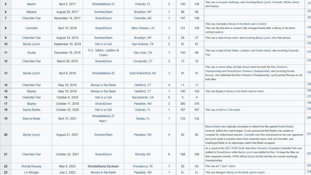 Morgan’s Smackdown Women’s Title reign might not be an incredibly long one. It remains to be seen whether Rousey will beat Morgan for the title at SummerSlam or not. You can check out the graphic below from Wikipedia to see how Liv Morgan broke that long 4 Horsewomen trend.