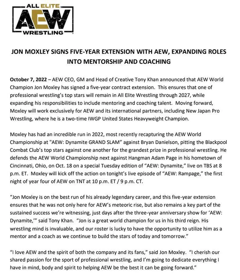 October 7, 2022 - AEW CEO, GM and Head of Creative Tony Khan announced that AEW World Champion Jon Moxley has signed a five-year contract extension. This ensures that one of professional wrestling's top stars will remain in All Elite Wrestling through 2027, while expanding his responsibilities to include mentoring and coaching talent. Moving forward, Moxley will work exclusively for AEW and its international partners, including New Japan Pro Wrestling, where he is a two-time IWGP United States Heavyweight Champion.