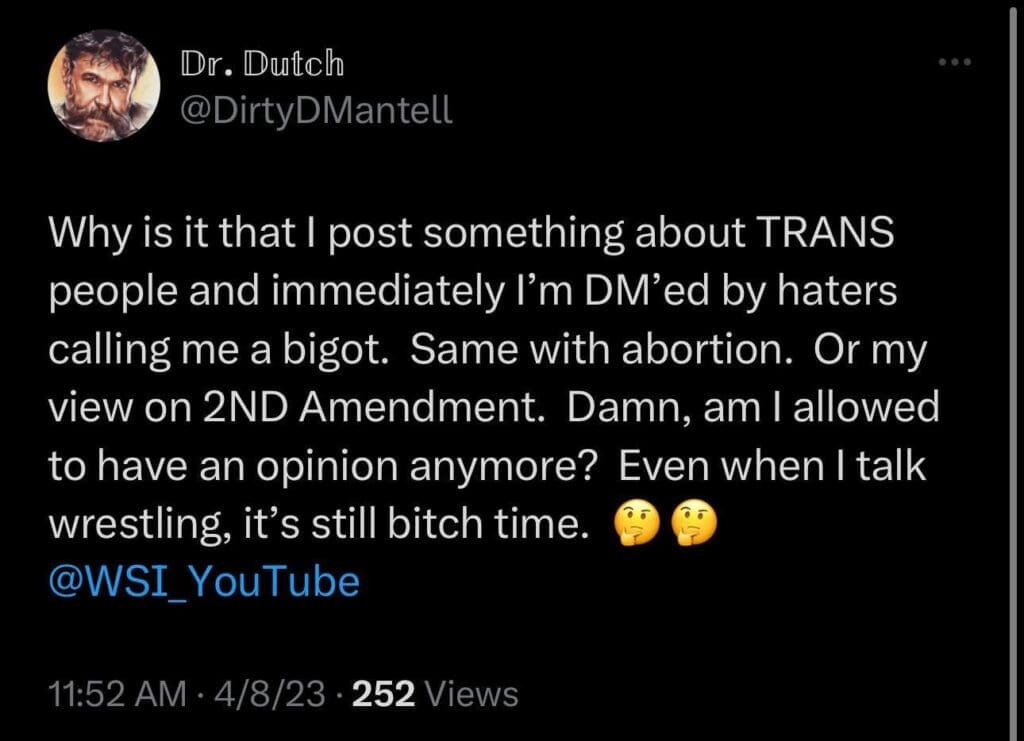 Why is it that I post something about TRANS people and immediately I’m DM’ed by haters calling me a bigot. Same with abortion. Or my view on 2ND Amendment. Damn, am I allowed to have an opinion anymore? Even when I talk wrestling, it’s still bitch time.