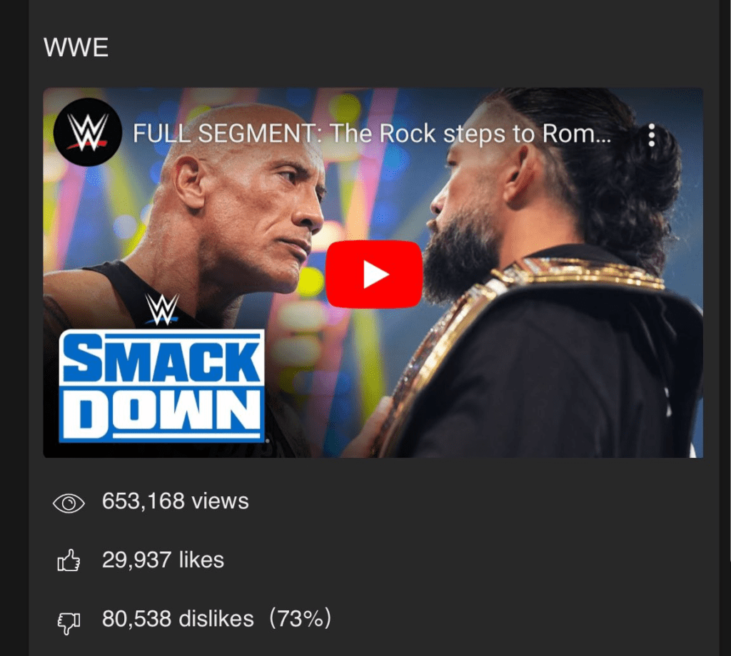Fans let their feelings be known on YouTube, as they ended up flooding the full segment between The Rock and Roman Reigns with dislikes. At the moment, the video has a staggering 80K dislikes in 4 hours, with 73% being negative.