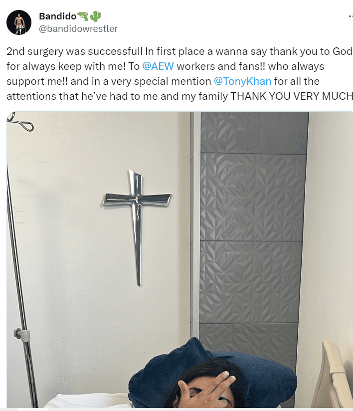 ''2nd surgery was successfull In first place a wanna say thank you to God for always keep with me! To @AEW workers and fans!! who always support me!! and in a very special mention @TonyKhan for all the attentions that he’ve had to me and my family THANK YOU VERY MUCH''