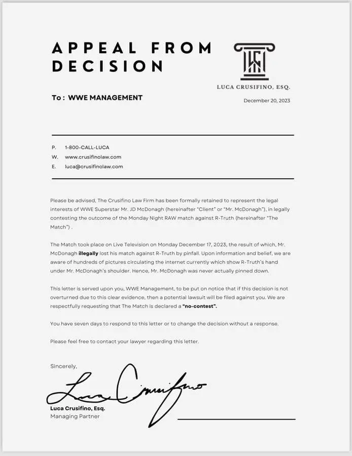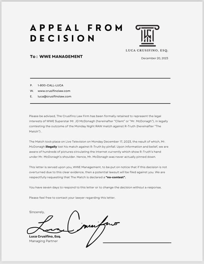 The letter sent out to Adam Pearce stated that, “Please be advised that The Crusifino Law Firm has been formally retained to represent the legal interests of WWE Superstar Mr. JD McDonagh.”