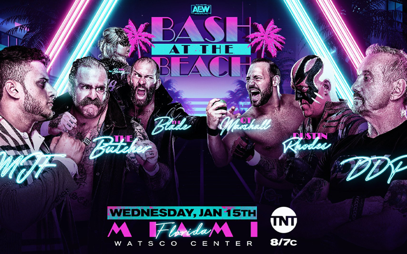 Tonight’s show will be themed around Dusty Rhodes’ brainchild PPV, Bash at the Beach. That means we’re getting some surfer vibes, along with a pretty stacked card. The biggest match of which is the four-way tag to determine the number one contenders, featuring Adam Page & Kenny Omega, Proud & Powerful, Best Friends, and The Young Bucks. This will no doubt be a typical high-octane AEW tag match that blows your mind before you have a second to think about logic or selling.