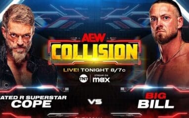 Back from the break, Big Bill dominates in the ring, working on Cope’s neck. Cope fights back with forearm strikes, followed by a series of knee shots that drop Bill. Cope covers for a near fall, but Bill kicks out at two. Cope runs the ropes, but Bill counters, slamming him to the mat. Bill goes for the pin, but Cope kicks out at two!
