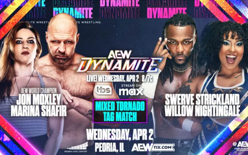 Tonight’s AEW Dynamite airing April 2, 2025, promises an action-packed night live from the Peoria Civic Center in Peoria, Illinois. The AEW Dynasty go-home show sees The Death Riders (AEW World Champion Jon Moxley and Marina Shafir) take on Swerve Strickland and Willow Nightingale in a Mixed Tornado Tag Team Match. Plus, “The Rated R Superstar” Cope faces The Death Riders’ AEW World Trios Champion Claudio Castagnoli in a Singles Match.