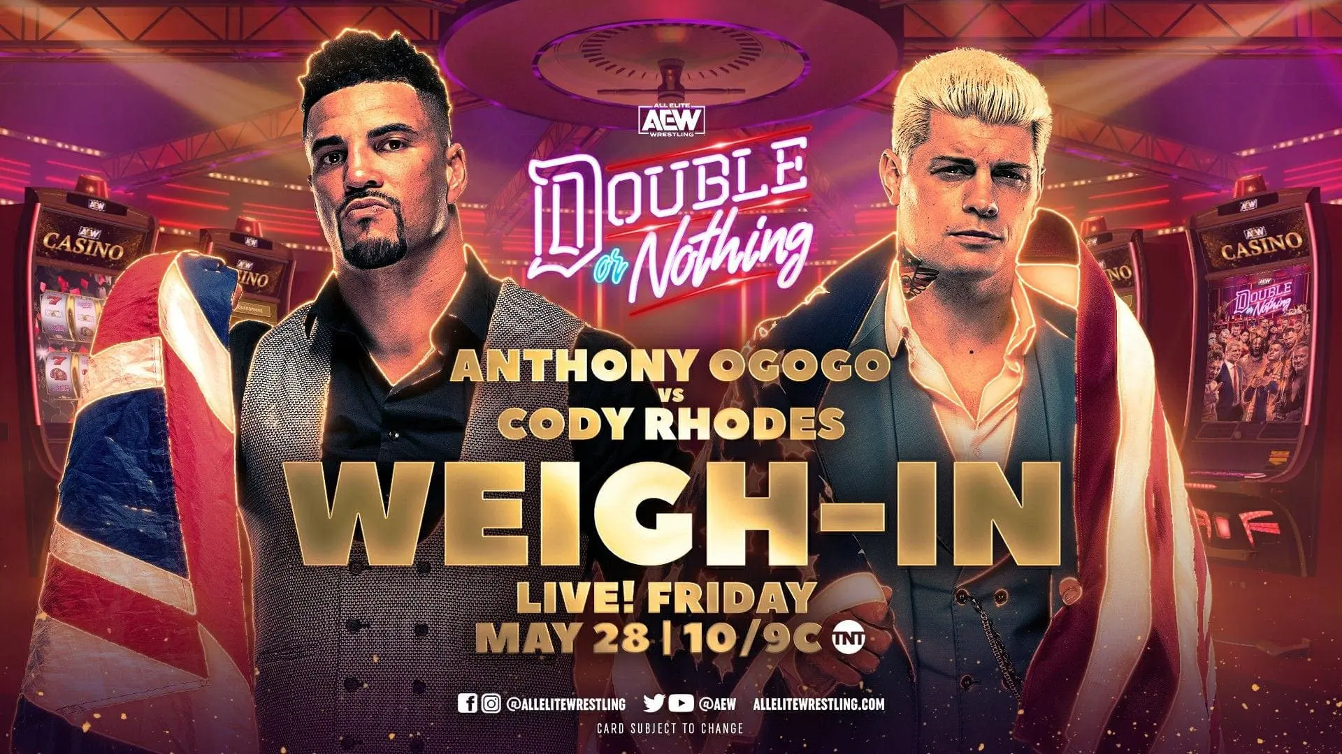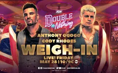 Wight first introduced Cody to weigh in. Cody strips off his tracksuit, Wight struggles with the scales for a bit but eventually Cody weighs in tonight at… 218 lbs. Anthony Ogogo strips off his tracksuit to show off some fancy union jack boxer shorts. Ogogo officially weighs in at… 219 lbs. QT Marshall interrupts Wight, bragging Ogogo is heavier so he will be the winner at Double or Nothing. Ogogos celebrates in the corner, raising his hands to the crowd to a chorus of boos. Cody goes up to the opposite corner and gets a big cheer. QT gets Ogogo to pose on another corner, to another chorus of boos.