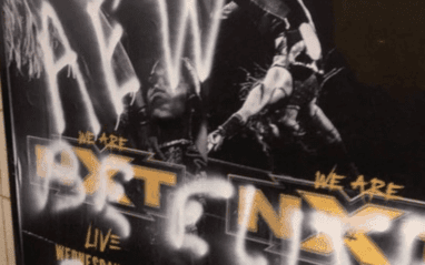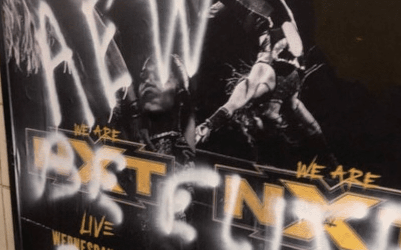 Someone spray painted “AEW BE ELITE TNT TNT” on the poster for NXT. You can check out the graffiti below. This particular incident took place at the 182 & Grand Station.