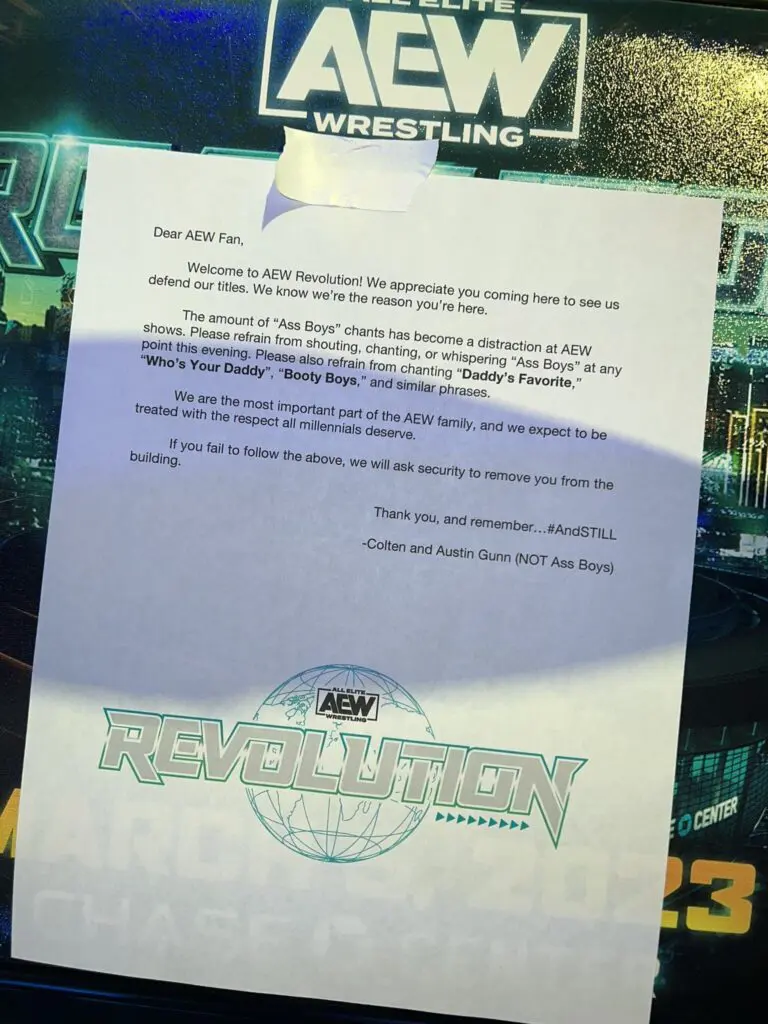 The amount of "Ass Boys" chants has become a distraction at AEW shows. Please refrain from shouting, chanting, or whispering "A** Boys" at any point this evening. Please also refrain from chanting "Daddy's Favorite," "Who's Your Daddy," "Booty Boys," and similar phrases.