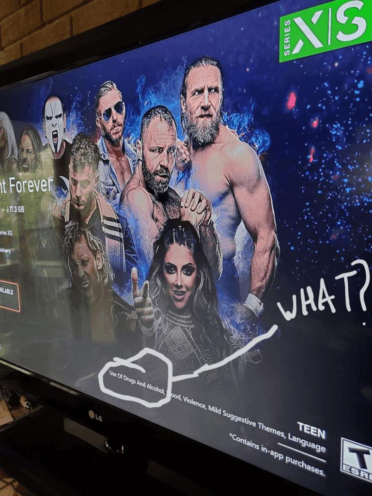 A photo of the new rating’s reason hit the internet, and plenty of fans wondered why it was listed as having drugs and alcohol in the game. Many fans made jokes about Jeff Hardy and other guesses that the story mode may include an after-party hosted by Tony Khan.