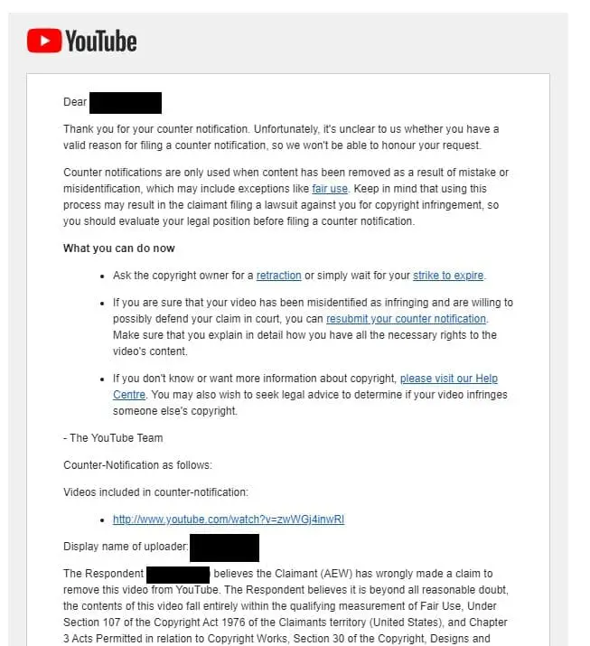 Such copyright strikes should not be permitted in a majority of these cases, but AEW is submitting takedowns anyway. YouTube’s policy is to take down the video and ask questions later. It is on the individual who submitted the strike to decide the channel’s fate. That is how YouTube works and AEW is allegedly abusing that system.
