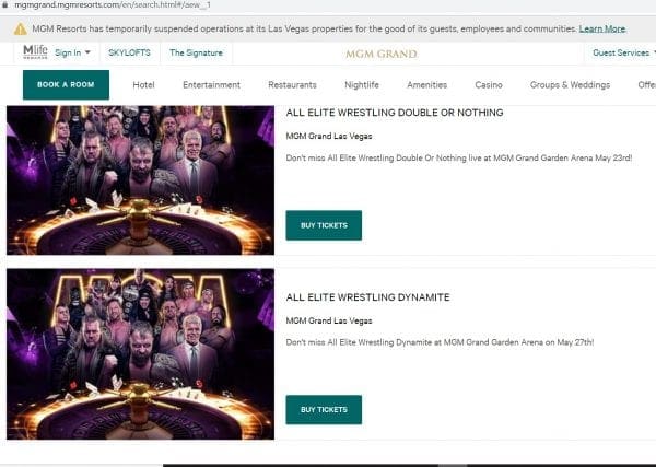 The MGM Grand cancelled all events until June 1st. AEW Double Or Nothing was not removed from the calendar. As you can see below, they are still selling tickets to the event.