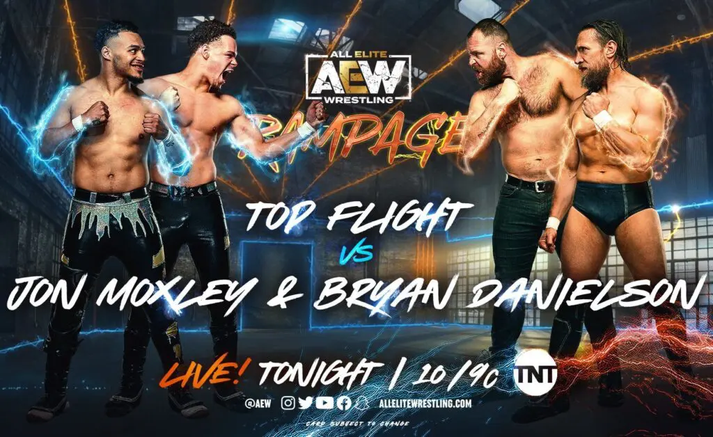 Rampage kicks off with Top Flight taking out Moxley during his entrance, Danielson responds by hitting a double Tope Suicida. The match officially begins with Darius Martin and Moxley in the ring. Darius hits a vertical suplex and Dante tags in and hits a splash over the top rope to Moxley. Moxley counters a sunset flip and tags Danielson in who hits a series of kicks to Dante on the mat. Danielson hits a running drop kick in the corner. Danielson hits a huricanrana but Dante flips through to his feet and tags Darius in who hits a drop kick. Moxley tags in as Dante tags back in and springboard dives off the top rope but Moxley counters with a kick. All four wrestlers get in the ring and start brawling before the brawl spills outside the ring. Back in the ring Danielson gets Dante into the Romero special before clawing at Dante’s face and transitioning int the dragon sleeper. Danielson tags Moxley back in who hits a kick to the chest. Moxley hits a superplex and then locks in the juji gatame.