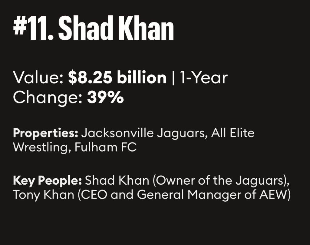 "Forbes did a story today on The World's Most Valuable Sports Empires in 2024. Shad Khan was listed at No. 11, listing an .25 billion value between the Jacksonville Jaguars, Fulham and AEW. According to those with knowledge of the story being put together, the AEW value was figured in at billion."
