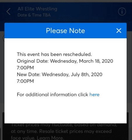The AEW website has already rescheduled the Dynamite event for next week to July 8th, 2020. Ticket Master is now alerting fans about this rescheduling.