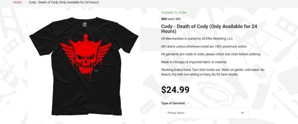 Cody Rhodes had a new t-shirt drop on Pro Wrestling Tees immediately following his big return. This new shirt is a bit special as it will only be available for 24 hours. The limited run t-shirt is titled “Death Of Cody.”