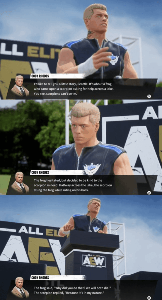 A screenshot is making the rounds of Cody Rhodes in the storyline mode in the new AEW Fight Forever game. He is cutting a promo about the scorpion and the frog, and that is a very familiar thing. The caption for that post said it all.