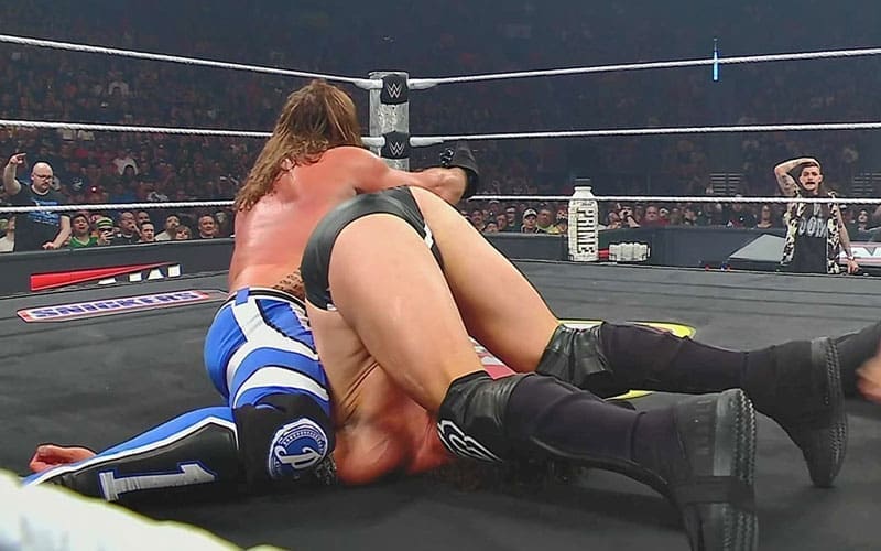 During the climax of the match, JD set up for a superplex, only for AJ to fight him off. But instead of following through with the next move, Styles remained awkwardly seated on the ropes for several seconds while nothing happened.
