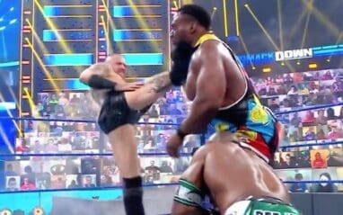 In the main event of the show, Apollo Crews defended the Intercontinental Title against Big E, Kevin Owens, and Sami Zayn. When it seemed as if Big E was going to win the match, Aleister Black suddenly came out and hit a Black Mass on Big E, costing him the match.