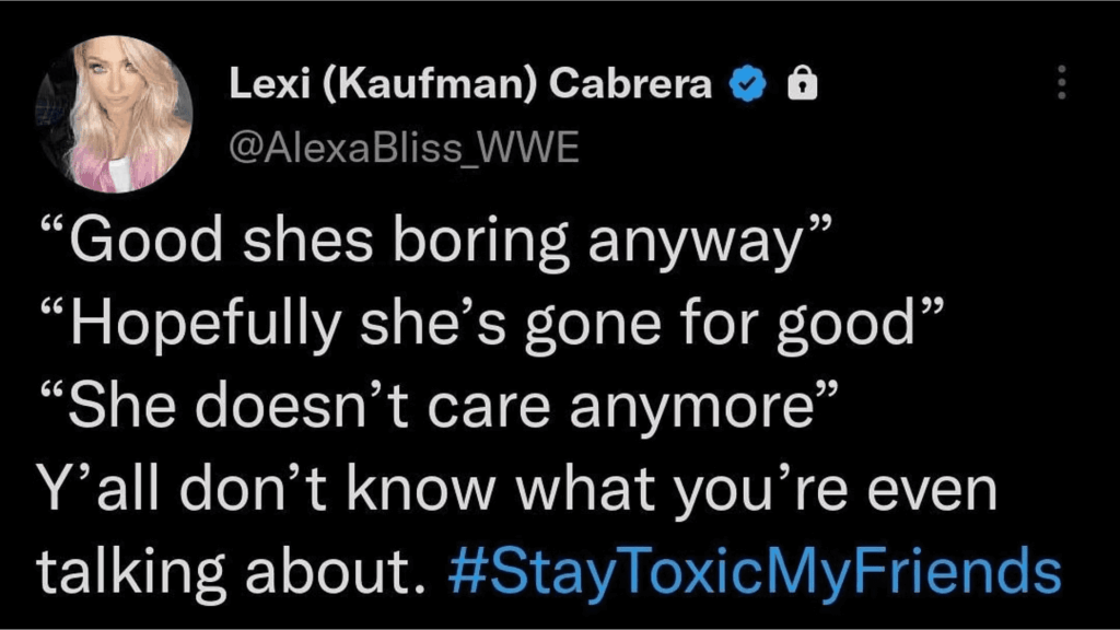 Alexa Bliss took to her Twitter and mentioned all the toxicity that she has been getting from fans, who accused her of no longer caring about her in-ring performance. Bliss made it clear, through her protected tweet, she does not care what anyone has to say.