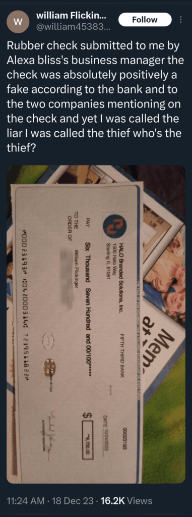 Unfortunately, that hasn’t stopped scammers who pose as Alexa Bliss online and dupe people out of their money. In a now-deleted tweet, a fan claimed that they have received a cheque from Alexa Bliss’ manager. The fan then added that the cheque turned out to be fake and accused Bliss of being a thief.