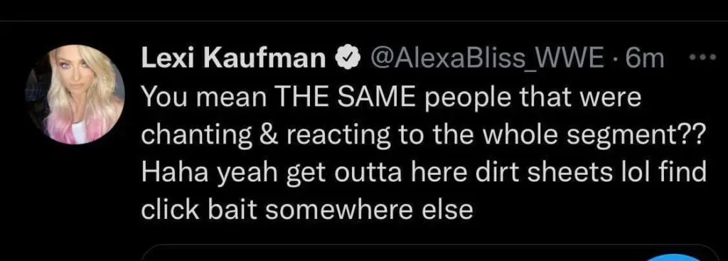 Bliss fired off a tweet to address this report. She said, “You mean THE SAME people that were chanting and reacting to the whole segment?? Haha yeah get outta here dirt sheets lol find click bait somewhere else.”