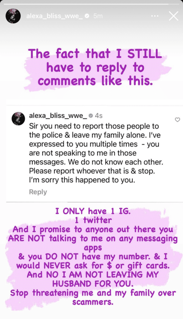 We will have to see how things pan out for this situation with Alexa Bliss. Hopefully, fans will stop believing scammers when they pose as her, because she has much better things to do than ask fans for money.