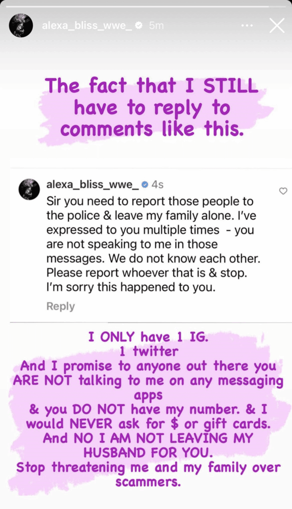The former WWE Women’s Champion tweeted out to say, “Sir, you need to report those people to the police & leave my family alone. I’ve expressed to you multiple times – you are not speaking to me in those messages. We do not know each other. Please report whoever that is & stop. I’m sorry this happened to you.” This was in response to a fan who kept harassing her over a relationship scammer who made him think he was talking to Bliss.