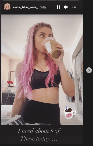 Alexa Bliss took to her Instagram stories and uploaded a photo of herself wearing a sports bra. Bliss revealed that she is obsessed with coffee and needs 5 cups of coffee.