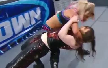 Alexa Bliss, Nikki Cross, Lacey Evans, and Tamina faced off for a #1 contender spot this week. Then Bliss nailed Cross with a Sister Abigail on the outside of the ring. This was complete with a kiss on the forehead.