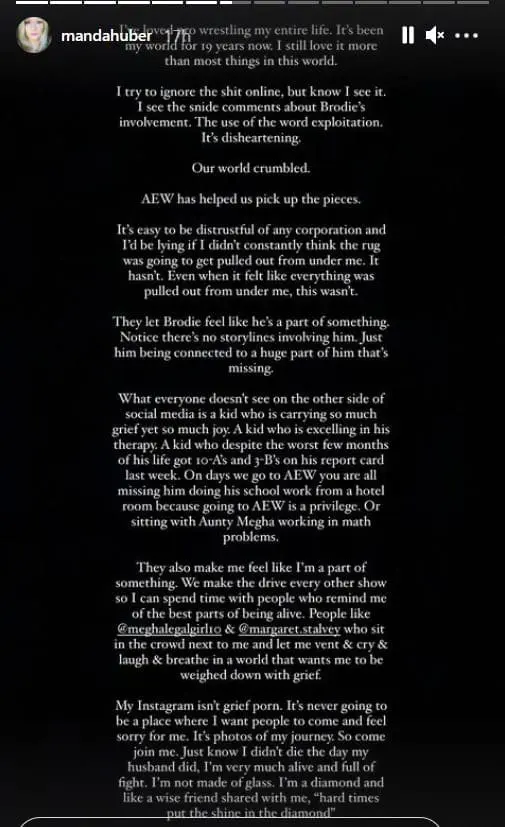 Amanda Huber, Brodie Lee’s wife, responded on an Instagram story to answer these critical fans. She explained how AEW has helped her family pick up the pieces after a devastating loss.