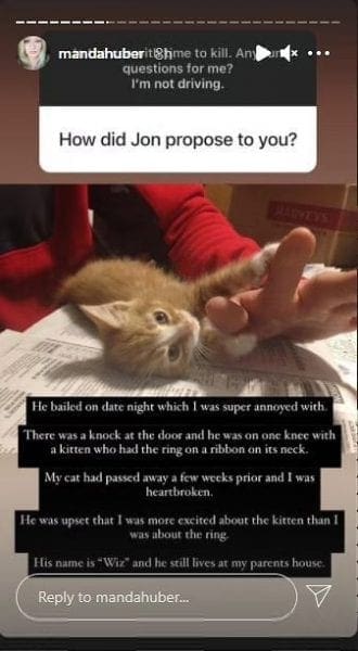 During a recent Instagram Q&A, Amanda Huber was asked how Brodie Lee proposed marriage. This took place weeks after her cat passed away. Brodie missed date night, but he later showed up with a kitten to help him pop the question.