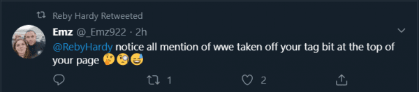 One fan tweeted out to Reby Hardy saying: “Notice all mention of WWE taken off your tag bit at the top of your page.” This post was retweeted by Reby Hardy.