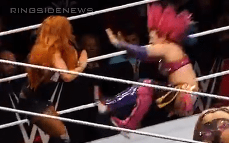During a recent WWE live event, Asuka attempted a pretty fun-looking co-op move with Charlotte Flair, but it didn’t go well at all. Instead, Asuka slipped off of Flair and went crashing to the mat in front of Becky Lynch who was her intended target.