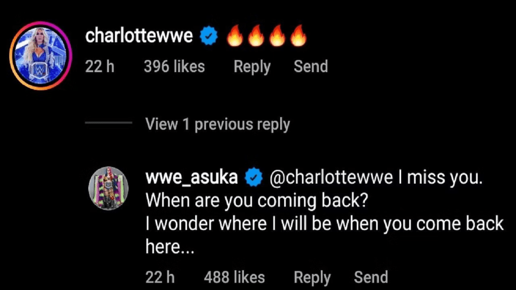 In fact, Asuka further continued to tease this change on two separate occasions. As previously reported, WWE is already making plans for Charlotte Flair’s return. Asuka uploaded another post featuring her gimmick as Kana, to which Flair commented on Instagram with a bunch of emojis. Asuka then replied to Flair, where Asuka made it clear she isn’t sure if she’ll even be in WWE by the time Flair is back.