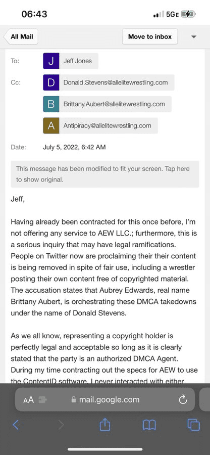 Starsky sent an email to Jeff Jones, formally announcing the accusation that Aubrey Edwards is behind these DMCA takedowns. Furthermore, she’s also operating under the fake alias of DMCA agent “Donald Stevens.” He also asked in the email if AEW doesn’t operate with an internal DPO team. He questioned why the company isn’t using software such as ContentID.
