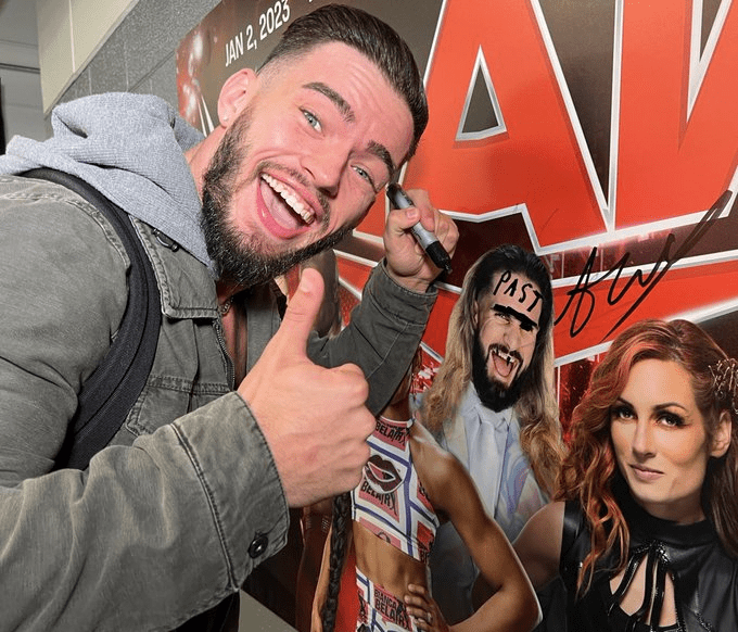 Now, just hours before Austin Theory is set to battle the Drip God in a one-on-one match for the star-spangled prize, the champion was seen defacing Seth Rollins’ poster before the start of Monday Night RAW in a photo posted by WWE on Twitter.