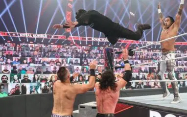 Bad Bunny entered himself into the Royal Rumble match, but he didn’t stay for long. The famous rapped scaled the top rope where he hit a big dive on The Miz and Morrison.
